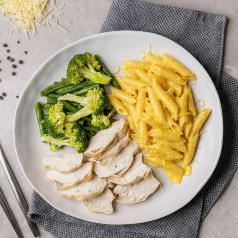Our Home Cooked Mac n Cheese with Grilled Chicken & Greens combines creamy, cheesy gluten-free pasta made with real cheddar and parmesan, tender grilled chicken breast, and a side of vibrant greens. It's the kind of meal that makes everyone at the table happy; kids love the familiar comfort, while parents appreciate the balanced nutrition and quality protein.