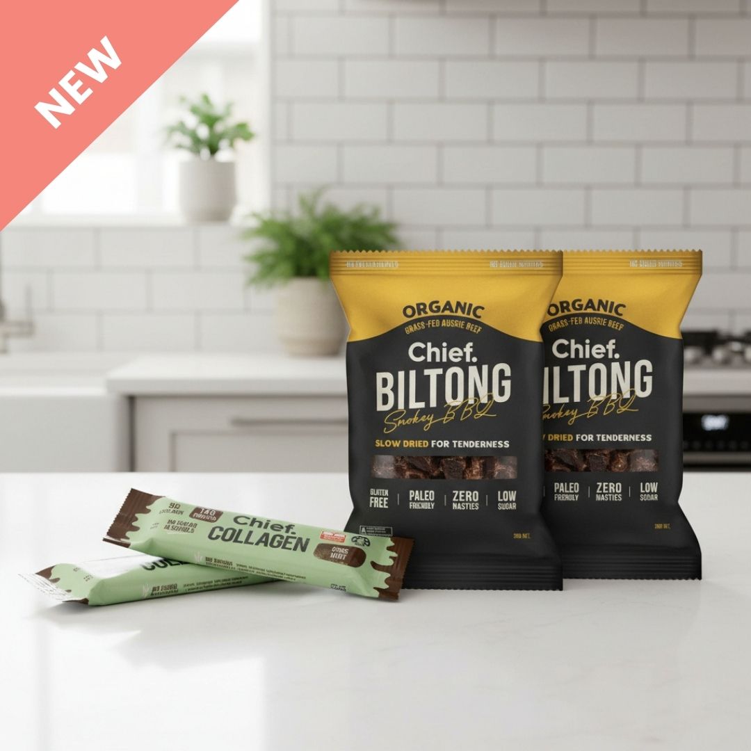 The Chief Smokey BBQ Biltong is made from organic, grass-fed, grass-finished Australian beef, slow air-dried for a tender texture and rich, smoky flavour with just a hint of chilli (not spicy). It’s high in protein, very low in sugar, and free from the nasties often found in dried meats — real savoury snacking done right.