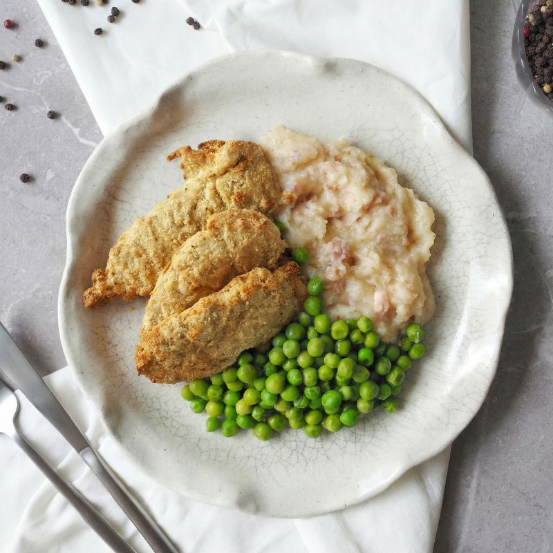 Indulge in the ultimate low-carb comfort meal — crispy, golden, and packed with flavour. We’ve upgraded this classic to oven-ready keto crumbed chicken tenderloins, perfectly seasoned for a juicy, tender bite with that irresistible crunch. Paired with creamy cauliflower mash and sweet peas, this dish is the perfect blend of texture and taste — hearty, satisfying, and completely keto-friendly.