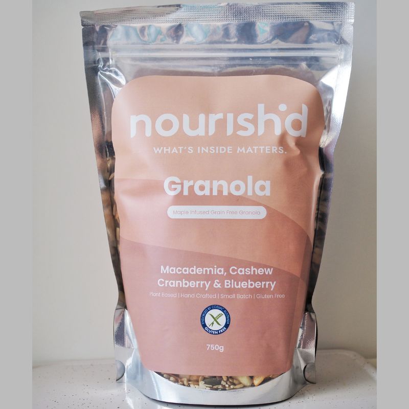 INGREDIENTS: Maple Syrup, Sunflower Seed, Pepita, Sesame Seed, Linseed, Cashew, Slivered Almond, Macadamia, Coconut, Blueberries, Cranberries, Vanilla.